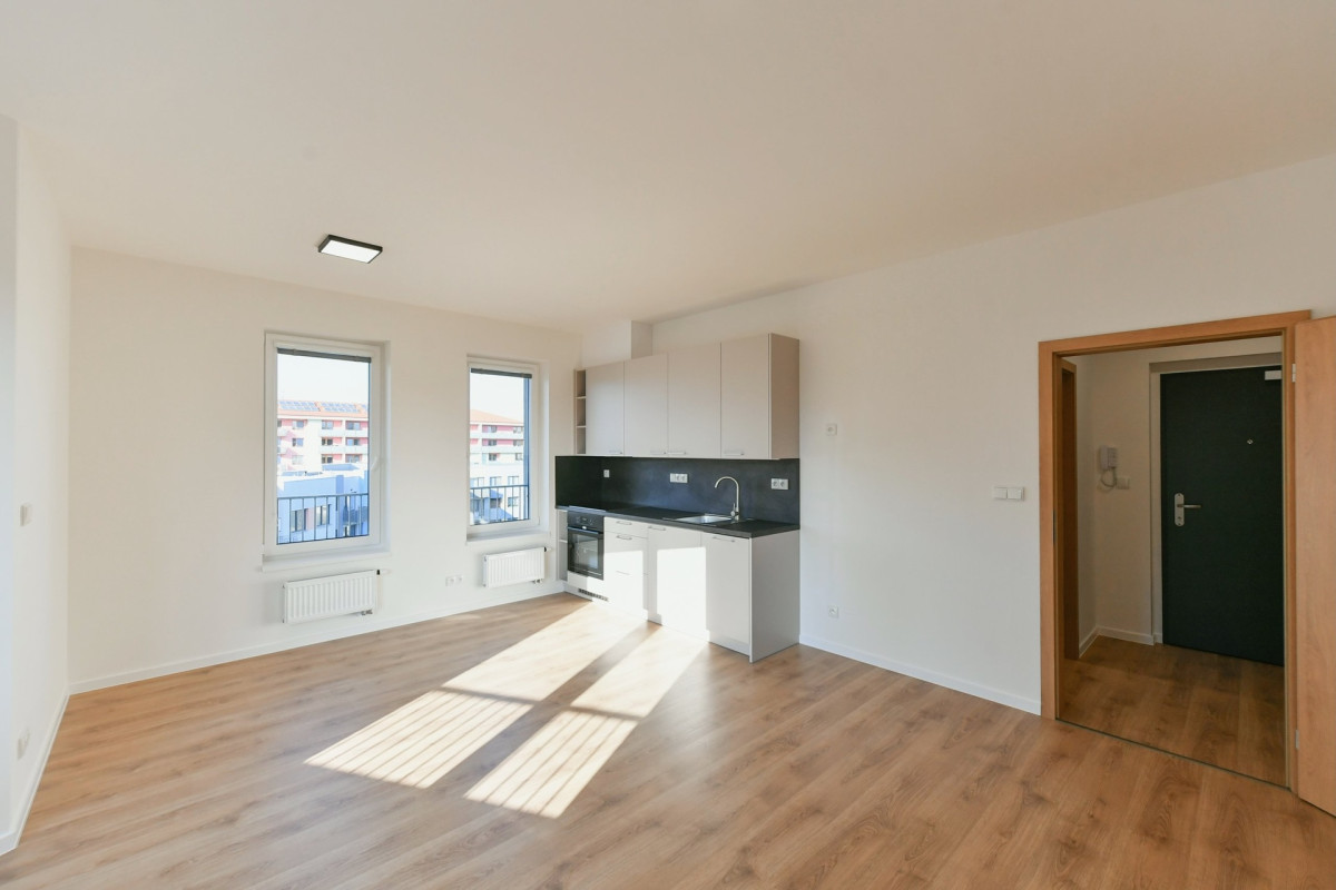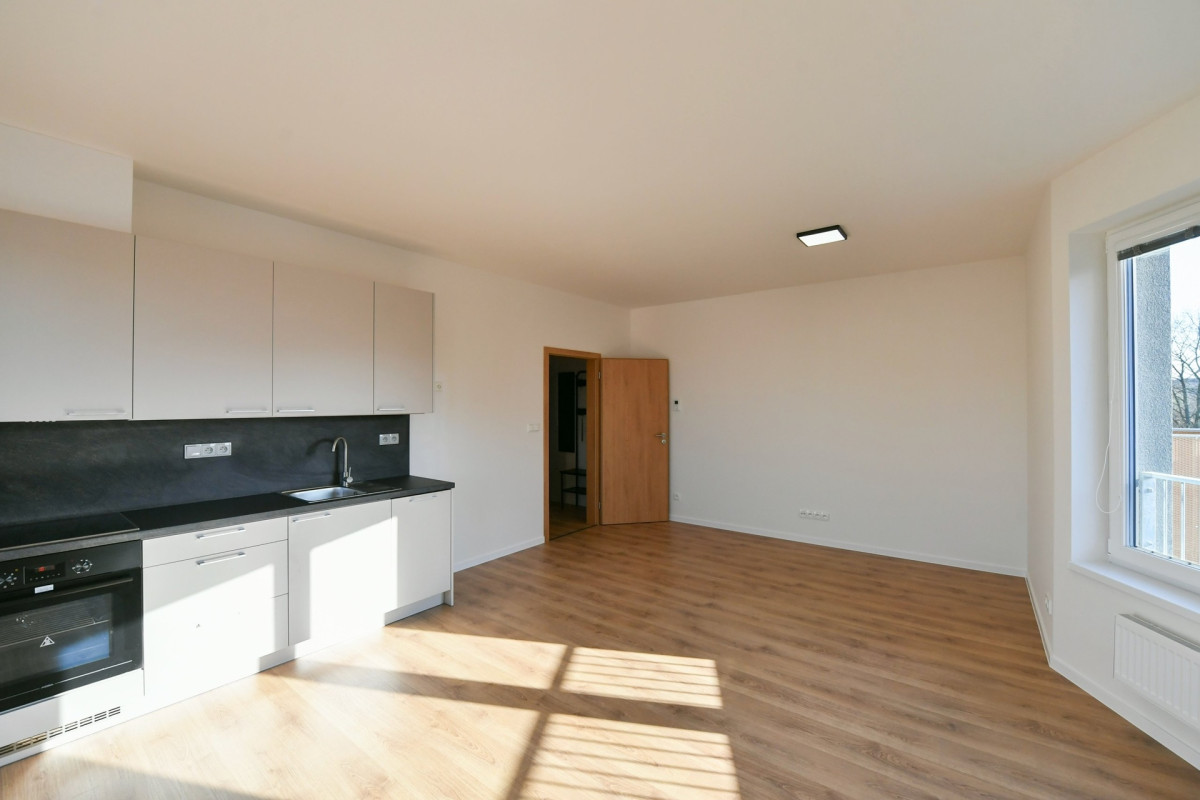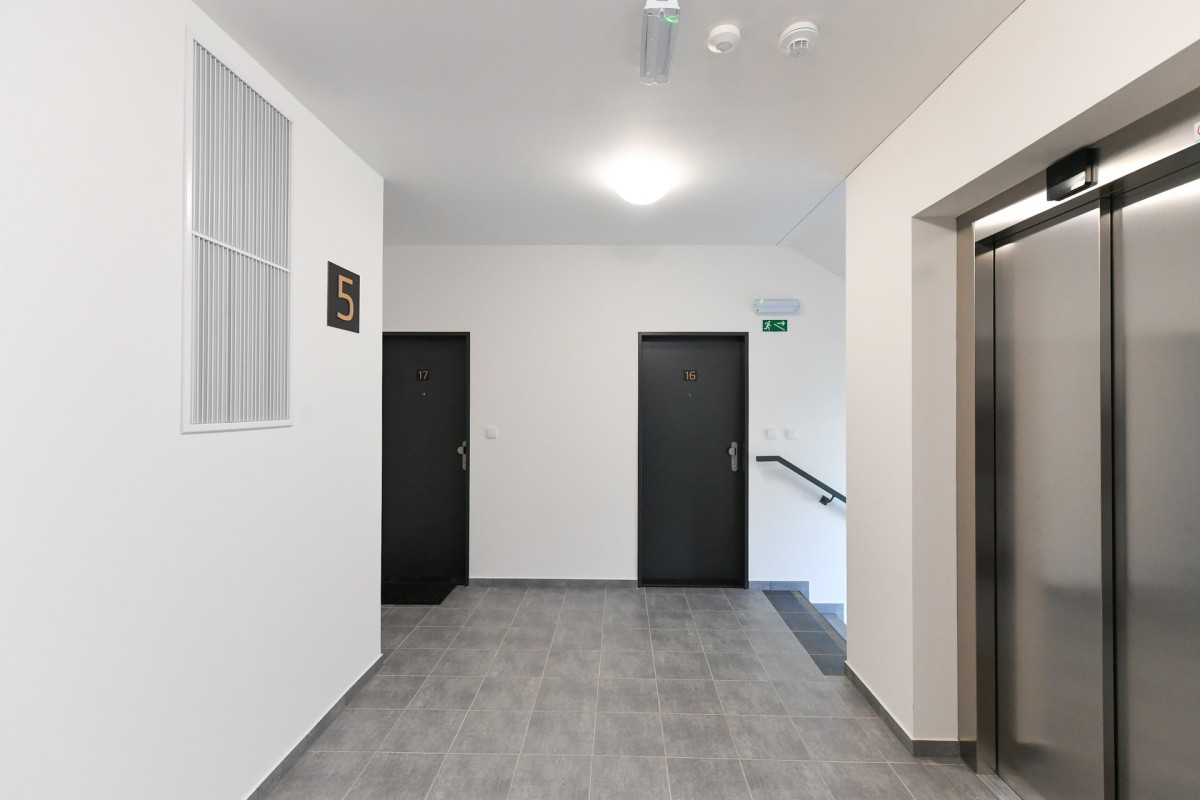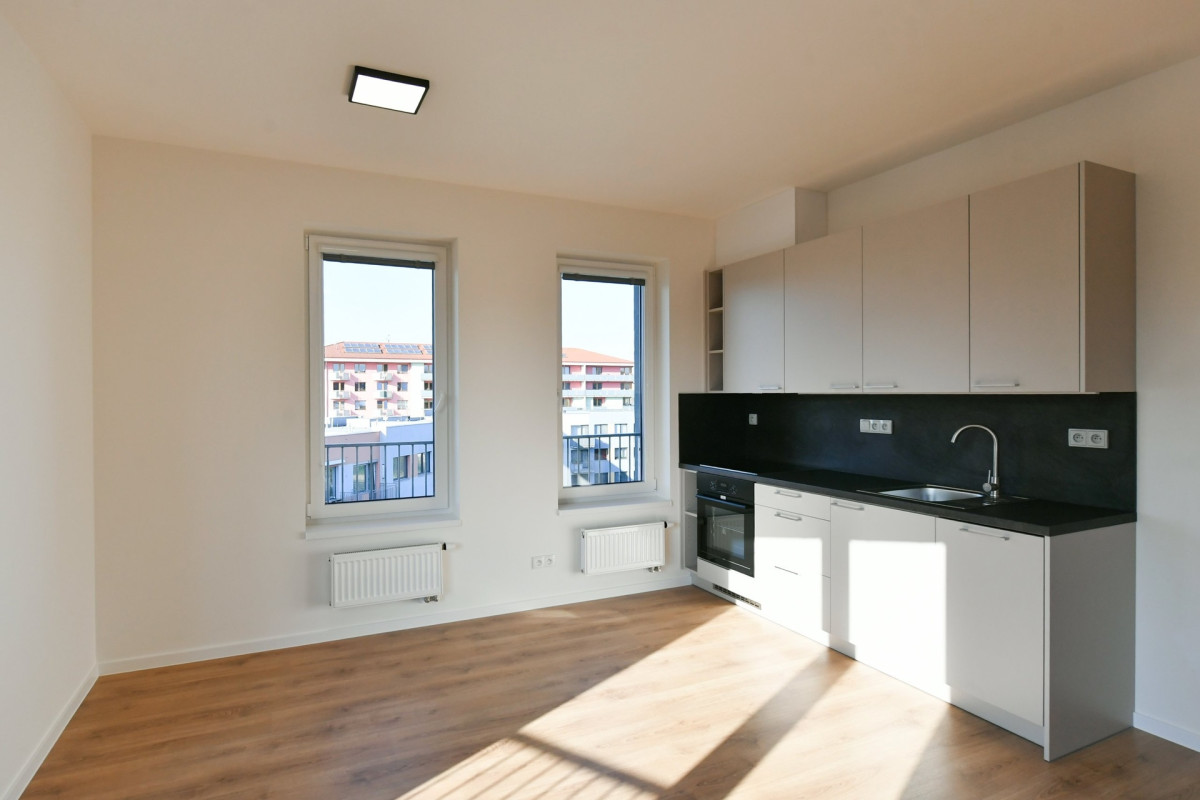 Byt o výměře 33,5 m2 (vnitřní plocha 31,2 m2) je umístěn v 5.NP novostavby bytového domu z roku 2025, který se nachází v širším centru města. Byt se pronajímá zařízený kuchyňskou linkou včetně vestavěných spotřebičů (varná deska, trouba myčka). Podlaha je v celém bytě plovoucí laminátová, v koupelně a na WC je dlažba. Orientace oken je na západ a sever. Vytápění zajišťuje centrální plynová kotelna v domě. Dům je vybaven výtahem. K bytu dále náleží sklepní kóje (2,3 m2) a je zde možnost pronájmu garážového stání za 2.000,- Kč/měsíčně, které je umístěné v suterénu.