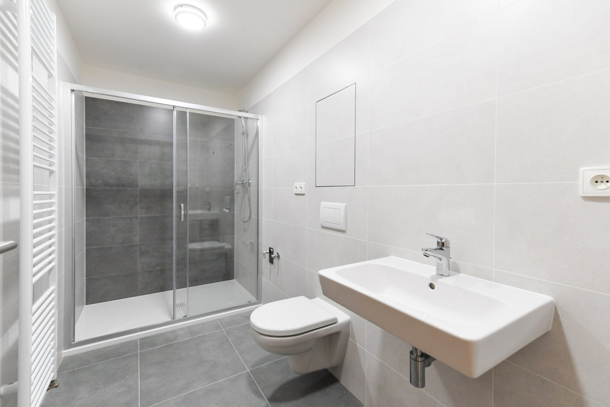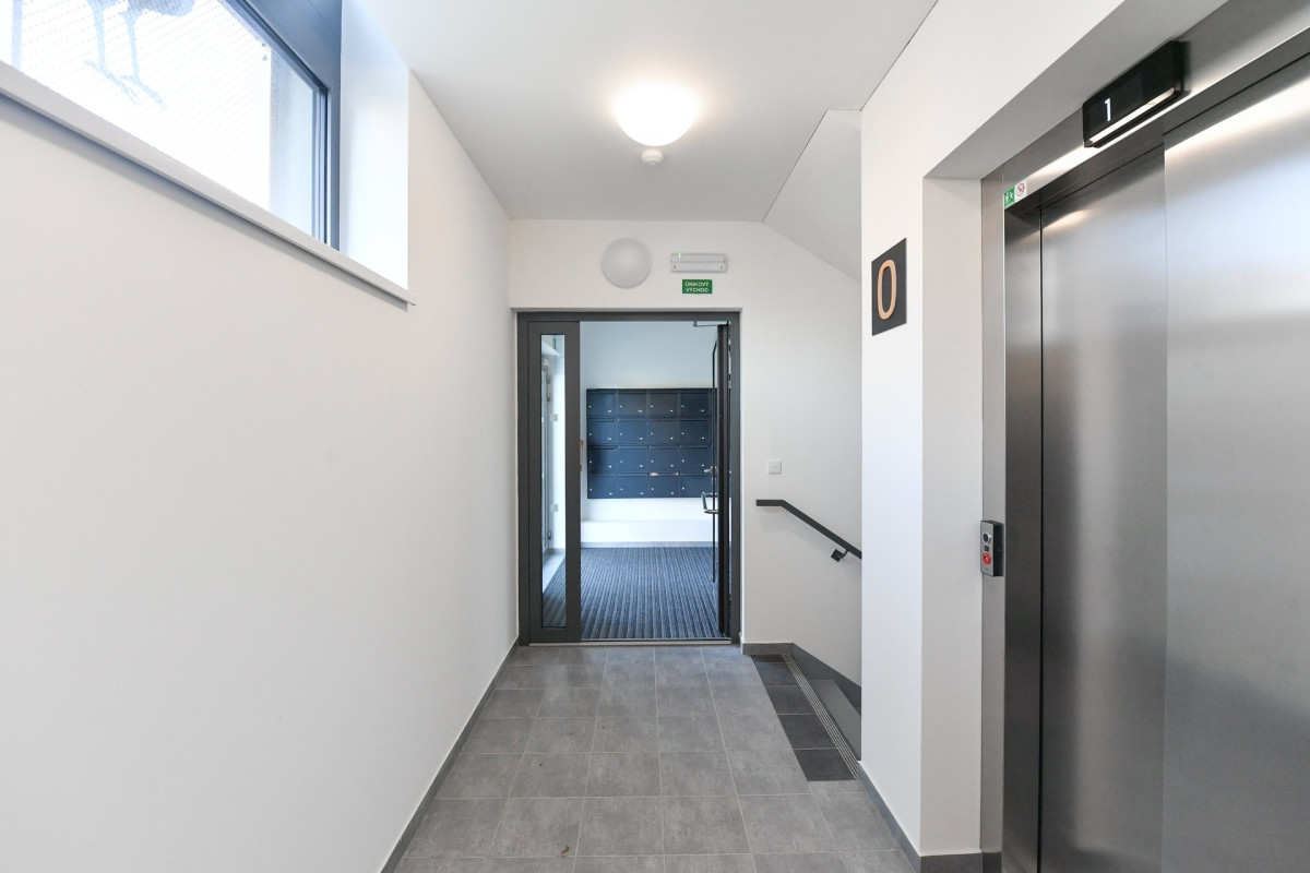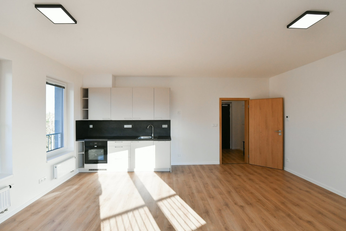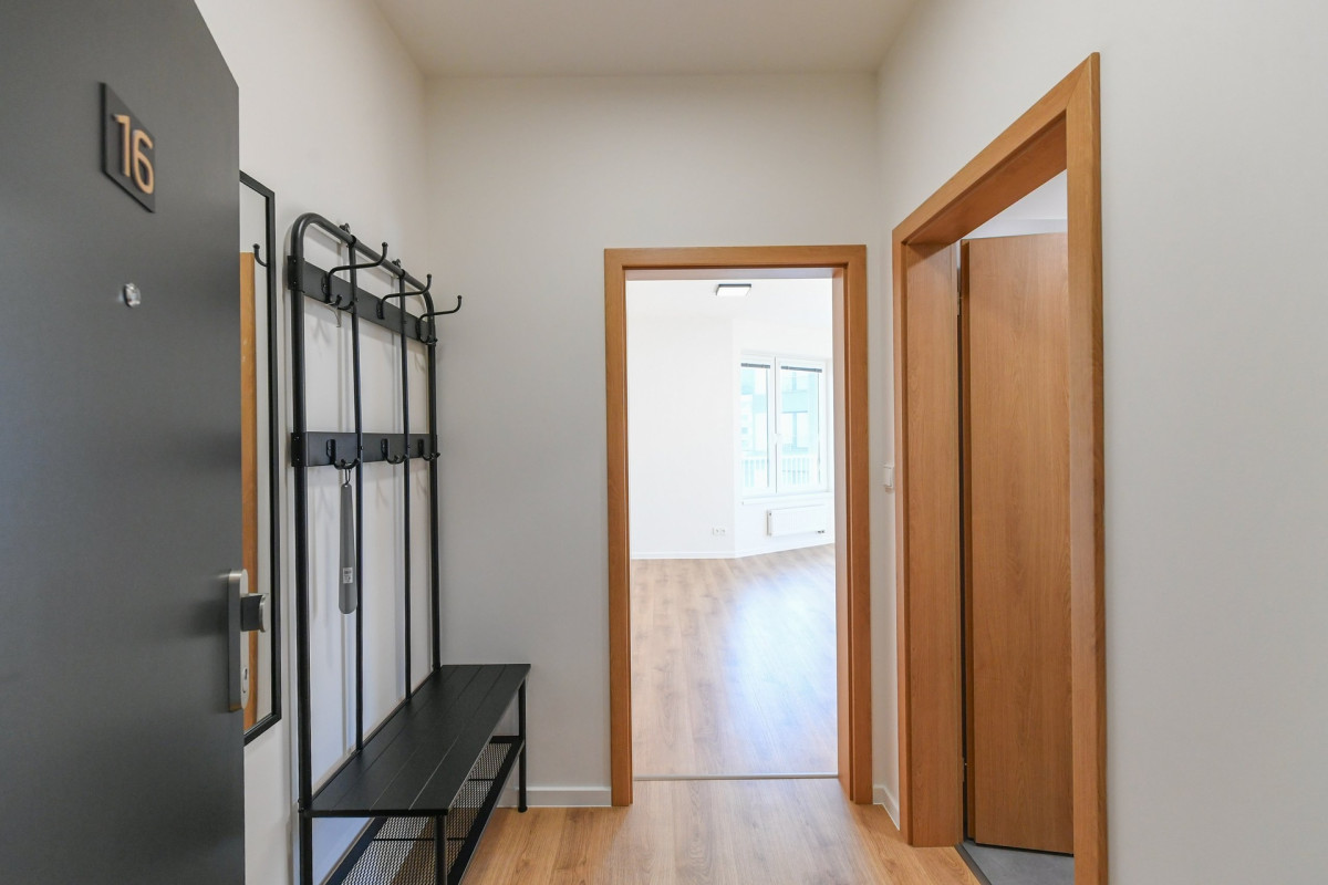 Byt o výměře 33,5 m2 (vnitřní plocha 31,2 m2) je umístěn v 5.NP novostavby bytového domu z roku 2025, který se nachází v širším centru města. Byt se pronajímá zařízený kuchyňskou linkou včetně vestavěných spotřebičů (varná deska, trouba myčka). Podlaha je v celém bytě plovoucí laminátová, v koupelně a na WC je dlažba. Orientace oken je na západ a sever. Vytápění zajišťuje centrální plynová kotelna v domě. Dům je vybaven výtahem. K bytu dále náleží sklepní kóje (2,3 m2) a je zde možnost pronájmu garážového stání za 2.000,- Kč/měsíčně, které je umístěné v suterénu.