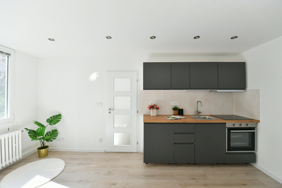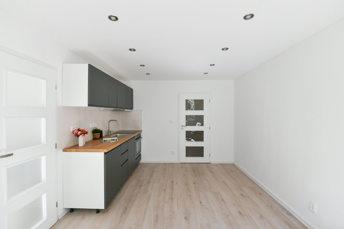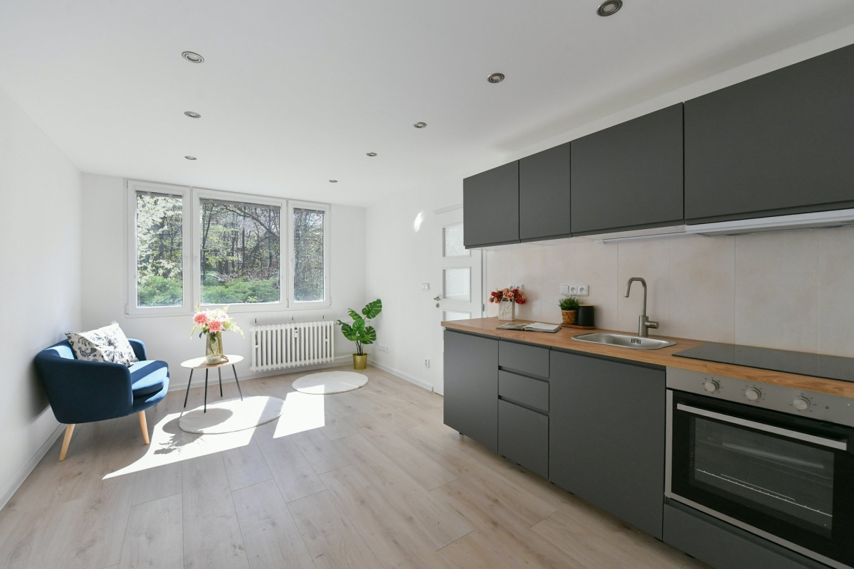 Byt o celkové výměře 38,7 m² (vnitřní plocha 36,41 m2, sklep 2,2 m2) je vyřešen velmi prakticky a tvoří jej: obývací pokoj s kuchyňským koutem, ložnice, předsíň, a koupelna se sprchovým koutem a WC. Byt je čerstvě kompletně zrekonstruován (změna dispozice z původní 1+1, nové podlahy, dveře, podhledy, kuchyňská linka, zděné jádro atd.). Okna bytu jsou orientována na jih. Byt se nenachází v úrovni chodníku a má výhled do vzrostlé zeleně. K bytu náleží sklepní kóje umístěná v suterénu domu. Dům průběžně prochází revitalizací.