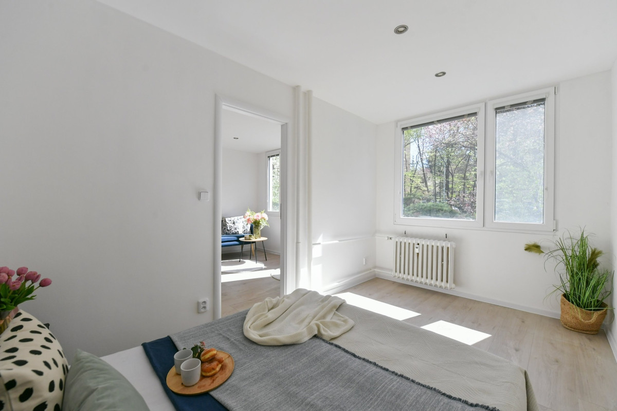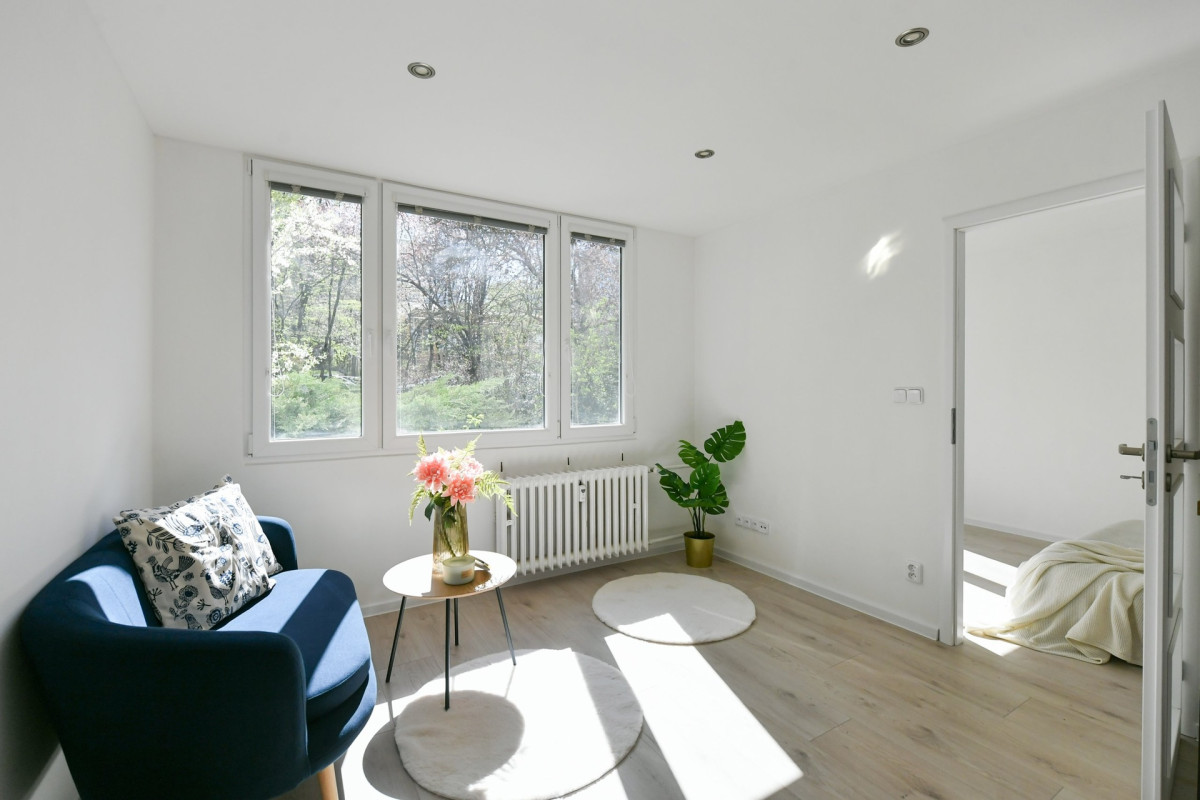 Nabídka prodeje bytu o dispozici 2+kk, ul. Hurbanova, Praha 4 – Krč. Byt je umístěn v 1. NP částečně revitalizovaného panelového domu s výtahem.